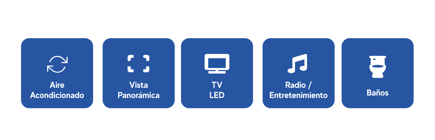 La experiencia se vive de una mejor manera en nuestros buses Full Equipo con aire acondicionado, tv, radio, baño y vistas panorámicas.